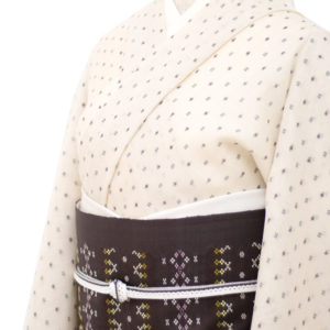 様々な博多帯がありますが、単色でこの奥行きは見事としか言いようがありません。蛇のお腹、ジャバラを模した「ジャバラ紋」の帯は、まさに、小森久を代表とする作風の一つではないでしょうか。糸の染色材料により黄色っぽい作品やピンク系の作品がありそうなのですが、今回入荷したこの色味が大人っぽくて好き。柄のリズム感も良い感じです。