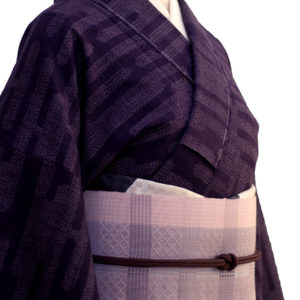 品の良い薄花色にローケツ染による横段が染め上げられています。帯から覗かせる色を変えることで、着こなしの幅が広がります。地色の部分も2タイプ同色ではございません。交わる配色に合わせて白寄りと生成り寄りの地色に分かれておりますので、両2枚お持ち頂いてもそれだけのコーディネートが決まります。