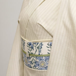 シャリ感と透け感があり、盛夏の着物に合う生地ですが、さらに、落ち着いた色味を活かして夏の前や秋風が吹く前など、気温の高い時期に単衣としてもおすすめです。また、反物の幅が40cmで、耳を抜かして約39cm(一尺五分)と広く、裄のある方や男性の着物としても仕立てることができます。