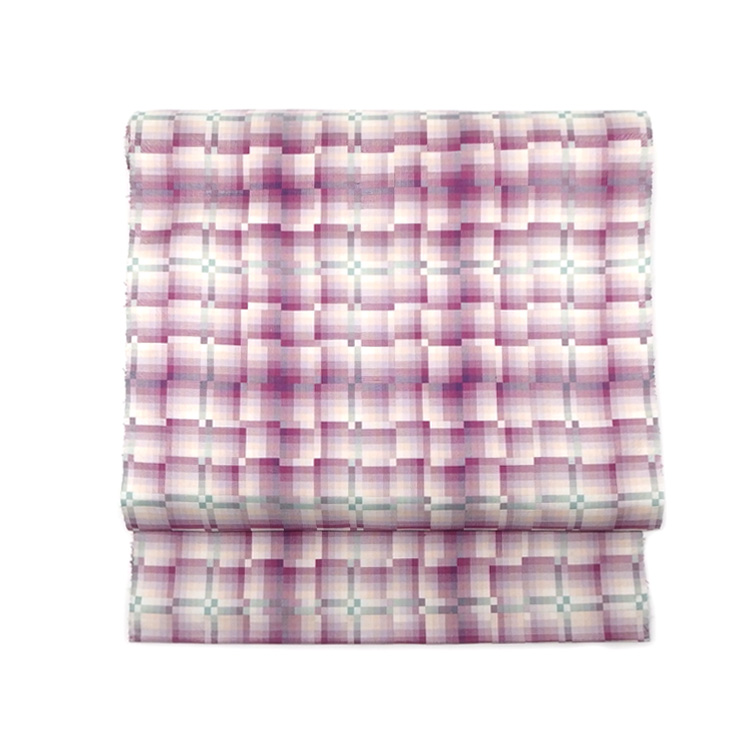 この帯も風通織で織られています。隣り合う経糸と緯糸の濃淡が互いに影響し、多彩な色彩が表現されます。手に取って、またはかけて作品を眺めた時には、音が聞こえてくるような無限のリズムと奥行きを感じさせます。絹糸ならでは質感と上品な華やぎは佐竹さんならでは、鑑賞にも堪える一作です。見事なセンスです。