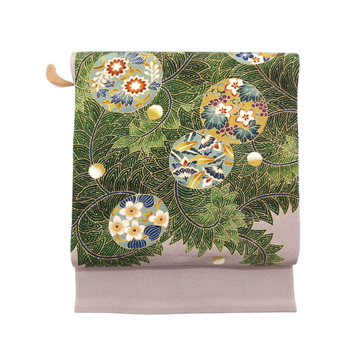 どちらの帯も非常に大らかに描き込まれた柄行きが特徴です。染められた面積も大きく、太鼓の位置によっても印象がガラリと変わり、非常におしゃれなアクセントになります。