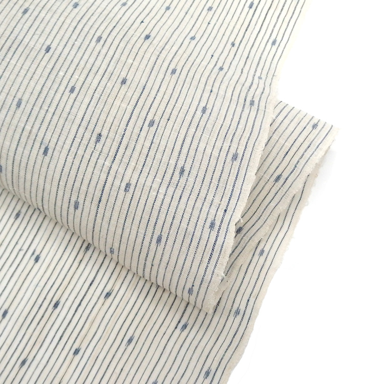 柄の復刻にあたり、新たに図案を起こし、経糸と緯糸の組み合わせを工夫。まるで雪のように澄んだ白の地に、藍の経絣がさわやかに映え、盛夏の空気に溶け込むような軽やかさと品格を感じさせてくれます。肌をすり抜ける風とともに、自然素材ならではの清涼感をお楽しみいただけます。