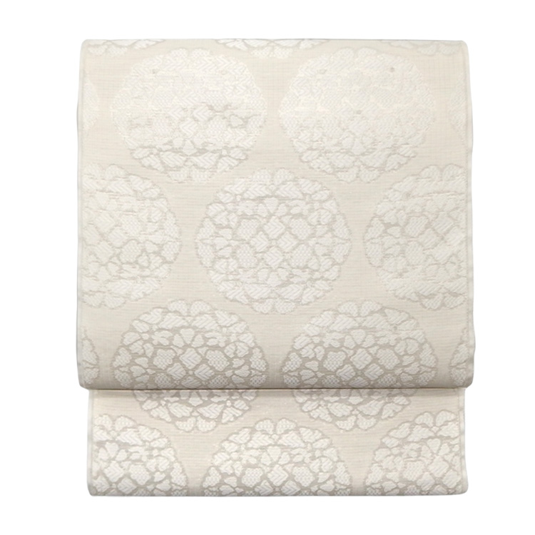 もう少しカジュアルな場面なら、織楽浅野の名古屋帯「天平花」を。生成の地に白と銀糸で織り出された丸文様が、抑えた光を帯びながら華やぎを演出します。