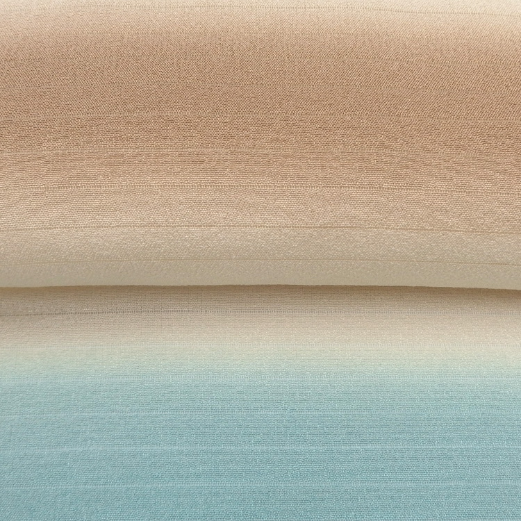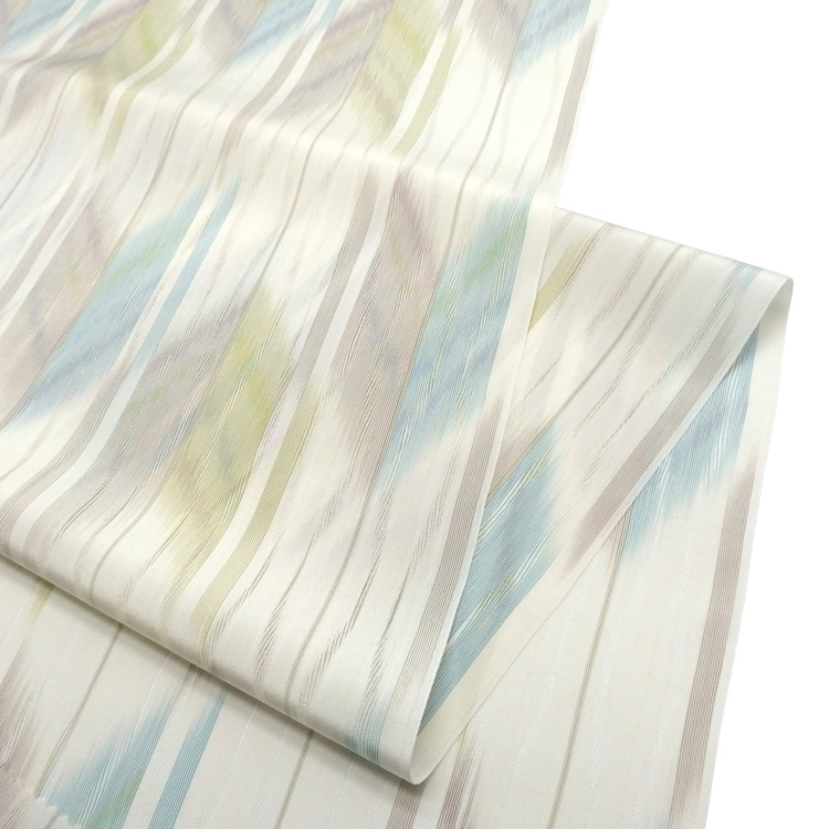 今回の着尺は、淡い水色、薄黄緑、グレージュといった涼感のある色合いが絣によって織り出され、静かながらも印象的な佇まい。光の加減で色がふんわりと浮かび上がる様は、まるで初夏の木漏れ日を纏っているかのような趣があります。