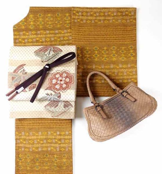 黄色の着物に含まれる一色、絣の模様からベージュを拾ってコーディネート。