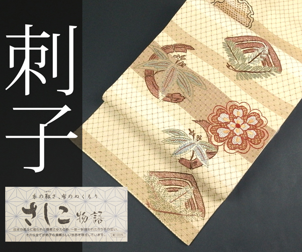 コーディネートに合わせたのはベージュ×刺し子の帯です。
