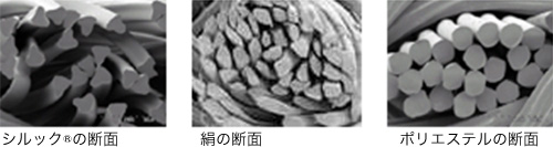 シルック®の着物は巷に出回る安いポリエステル着物とは全う品質です。まず、限りなく正絹に近い質感を表現する糸についてです。写真を公式サイト内より引用致しましたが、糸の断面を正絹に近づけ、天然繊維特有の光沢やドレープ感を表現しています。