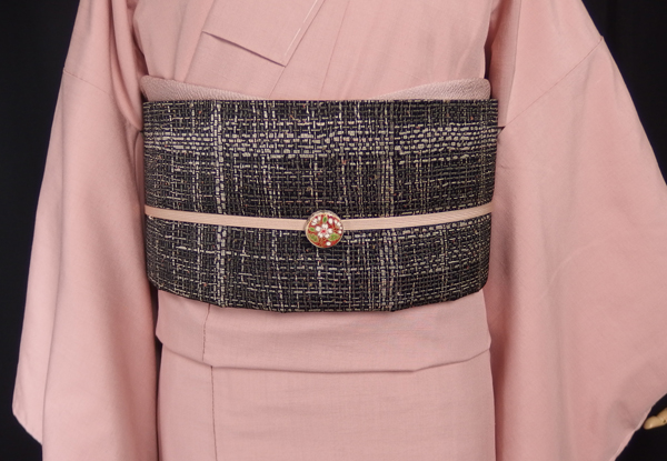 アッシュ・ピンクの紬×グレーの帯のコーディネートにプラスしてみましたが・・良い雰囲気です。ポップ過ぎないデザインの帯留めなら、大人な着こなしにもぴったりフィットします。