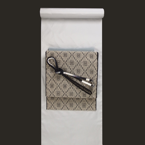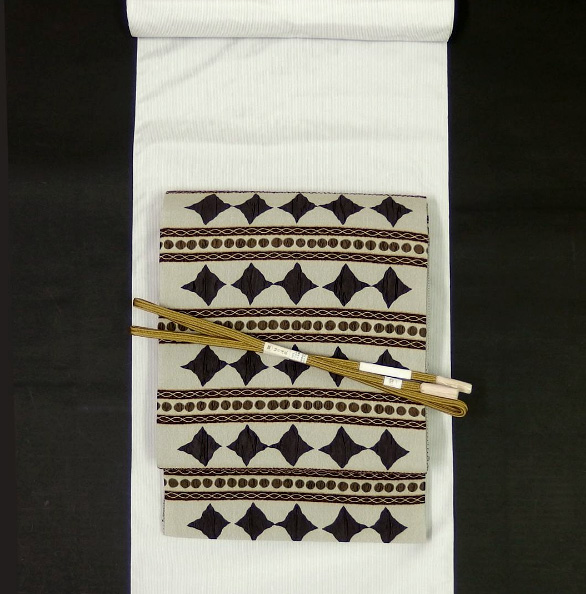 こちらは御召帯。もともと御召を得意とする織元さん、まさに定番の商品です。無地感覚の白大島は都会的でモードなコーディネートがやっぱり定番。こんなアプローチの帯ならまさにモードに決まります。