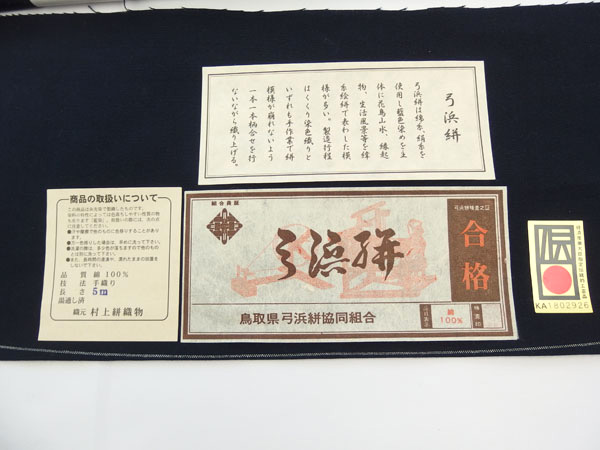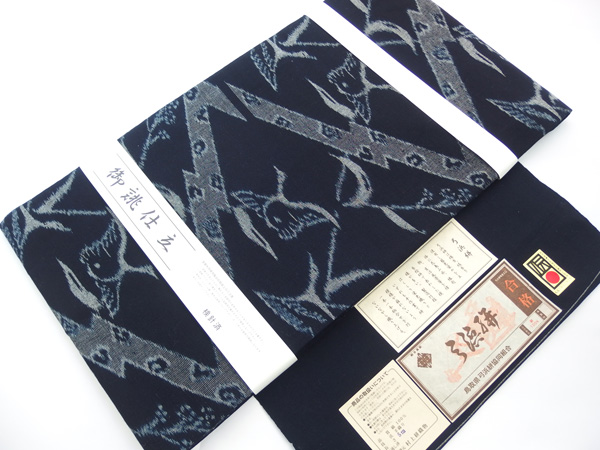 国指定伝統工芸品(1975) / 鳥取県指定無形文化財(1978)に指定。鳥取県 弓ヶ浜地方で製造される綿糸の絣織物。広瀬絣、倉吉絣と合わせて山陰の三大絣と呼ばれています。松竹梅や鶴亀のような縁起物モチーフが主流。今回ご紹介の作品と同じく未来に羽ばたくように鷹、しっかりと婚家に腰を落ち着ける錨(いかり)などのモチーフも見られます。