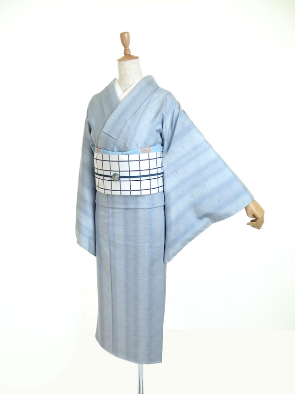 【高島礼子さん着用】新品 お仕立てあがり■即日発送可■ぜんまい×花織 袷着物 織三昧 / 青灰色の濃淡の縞 × 白と薄青の花織 / エレガントな着姿に