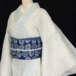 きものは新里玲子氏作 宮古上布~白夜~ 、帯は城間栄市氏作 ウニをモチーフにした本場琉球藍型の帯です。共に工房正規品。