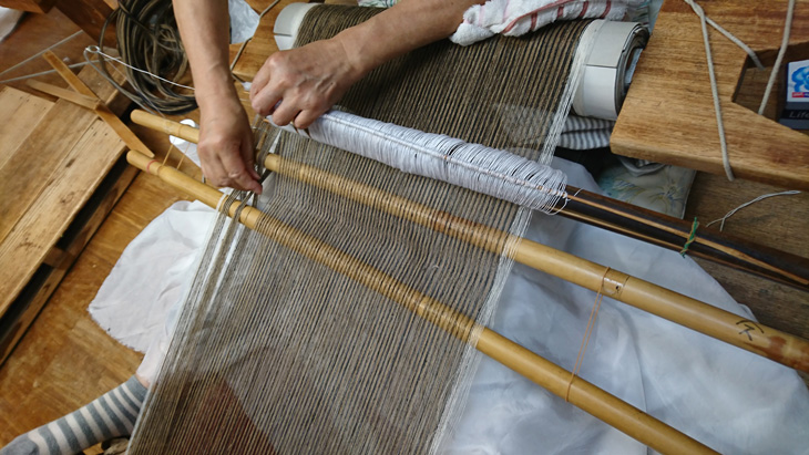 結城紬には地機(じばた)と高機(たかばた)の二つの織り方があります。今回入荷した二点は地機にこだわって選んでみました。大変な手間と熟練の技が必要な、床に座るような姿勢で織る、いざり機で織るのが地機の結城紬ですが、木綿の糸を使う”糸そうこう”は経糸の張り具合を腰でいつでも調整ができるため、ふんわりとした風合いで織り上げることができます。絹糸はまさに生きており、湿度や天候で張り具合が変わります。高機では、一度経糸をかけると張り具合を調整することはできません。また、高機に比べて大きな筬(おさ)をつかい糸を打ち込みます、そのため、織地にしっかり感もつくることができます。この二つが組み合わさり、あの最高の風合いを持った”地機”の結城紬が完成するのです。本場結城紬の特性上、経糸よりも緯糸が細く、そして、二回の打ち込みを必要とする工程があります、他産地の紬に比べて、打ち込む回数も飛躍的に多くなります。一生着られるそのしっかりとした織味はここから生まれます。