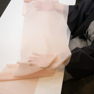 上原美智子氏の作品は国内のみならず海外でも高く評価される美しい布です。セミの羽のようと例えられる優しい透け感のあけずば織が代表作であり、それをもとに織られた、こちらの立涌の帯はまさに帯としての代表作。